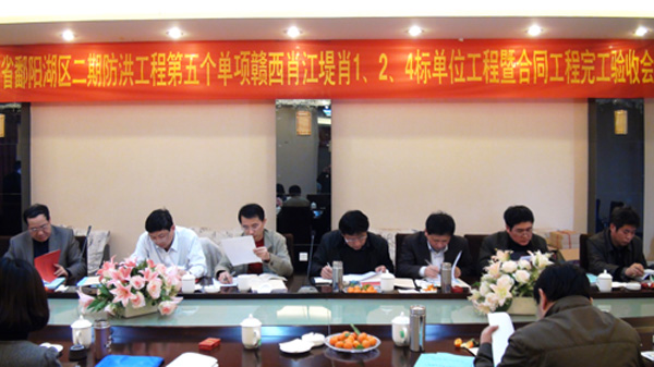 驗(yàn)收會(huì)由江西省鄱陽湖區(qū)二期防洪工程第五個(gè)單項(xiàng)工程建設(shè)項(xiàng)目部副主任陶理志主持,建設(shè)項(xiàng)目部總工程師鄒軍賢、宜春市水利局劉啟明副局長、樟樹市水利局吳學(xué)輝、公司副總經(jīng)理胡鴻煌等出席了驗(yàn)收會(huì)。