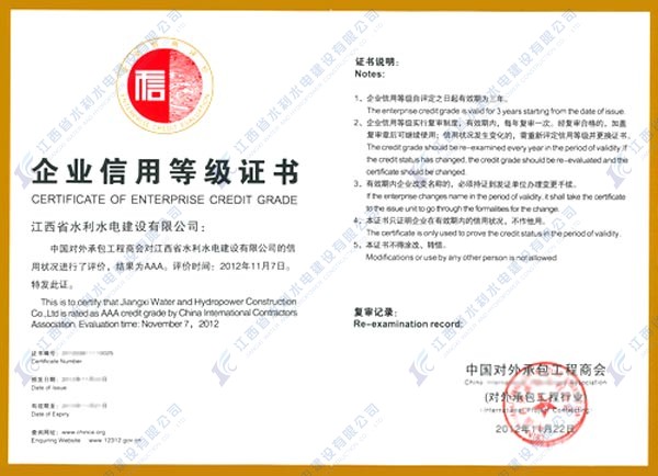 集團(tuán)資訊根據(jù)商務(wù)部、國資委聯(lián)合發(fā)布的《商會協(xié)會行業(yè)信用建設(shè)工作指導(dǎo)意見》的要求,中國對外承包工程商會于2012年9月啟動2012年度對外承包工程與勞務(wù)合作企業(yè)信用等級評價(jià)工作。經(jīng)對外承包工程與勞務(wù)合作企業(yè)信用等級評審委員會第八次工作會議審議,江西省水利水電建設(shè)有限公司被評定為2012年度對外承包工程企業(yè)信用評價(jià)AAA級信用企業(yè)。