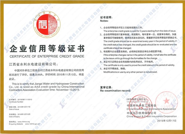 根據(jù)商務部、國資委聯(lián)合發(fā)布的《商會協(xié)會行業(yè)信用建設工作指導意見》和《關于進一步做好行業(yè)信用評價工作的意見》的要求,結合承包商會關于推進行業(yè)信用體系建設的工作部署,承包商會于2015年7月啟動2015年度對外承包工程企業(yè)與勞務合作企業(yè)信用等級評價工作,經(jīng)對外承包工程企業(yè)與勞務合作企業(yè)信用等級評審委員會第十一次工作會議審議,江西省水利水電建設有限公司被評定為2015年度對外承包工程企業(yè)信用評價AAA級信用企業(yè)。