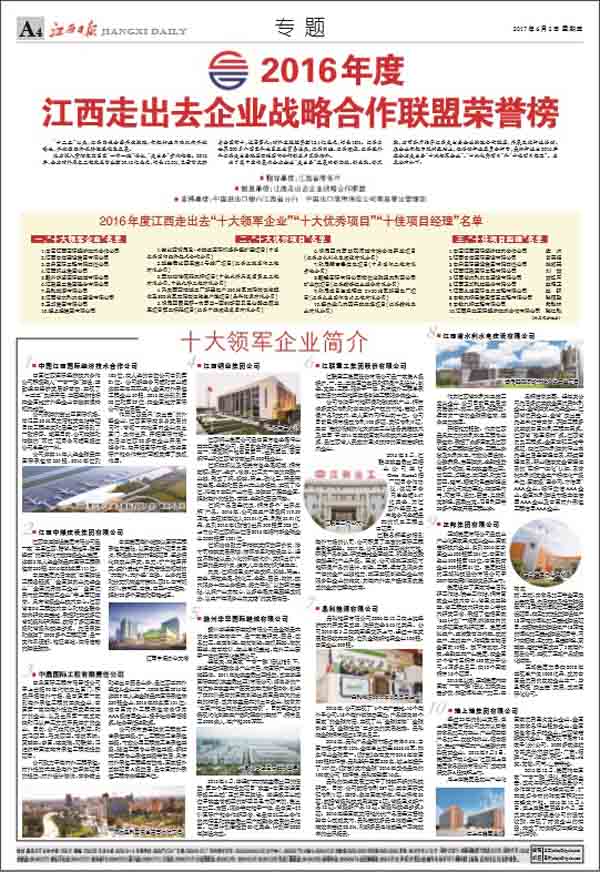 6月3日,江西走出去企業(yè)戰(zhàn)略合作聯(lián)盟2017年大會(huì)在南昌召開。省委常委、常務(wù)副省長毛偉明出席大會(huì)并作重要講話,會(huì)上省委常委、常務(wù)副省長毛偉明、省政府秘書長王亞聯(lián)和省商務(wù)廳廳長王水平分別為2016年度全省走出去“十大領(lǐng)軍企業(yè)”、“十大優(yōu)秀項(xiàng)目”和“十佳項(xiàng)目經(jīng)理”授牌。江西走出去企業(yè)戰(zhàn)略合作聯(lián)盟輪值主席、中國江西國際經(jīng)濟(jì)技術(shù)合作公司總經(jīng)理徐國建報(bào)告了2016年工作,國家開發(fā)銀行江西分行、中國進(jìn)出口銀行江西省分行和中國出口信用保險(xiǎn)公司南昌營管部作為聯(lián)盟副主席單位發(fā)言。公司董事長王元旦作為十大優(yōu)秀項(xiàng)目的企業(yè)代表發(fā)言?!督魅?qǐng)?bào)》、《江西衛(wèi)視》相繼對(duì)大會(huì)進(jìn)行了大幅報(bào)道。