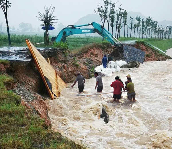 暴雨肆虐,洪災(zāi)無情。7月8日,雨勢加大,險情加重,出現(xiàn)漫堤、農(nóng)田被淹等險情,國家財產(chǎn)和人民群眾的生命安全正面臨嚴(yán)重威脅,危難當(dāng)前彰顯擔(dān)當(dāng),公司副總經(jīng)理曾朝文、總經(jīng)理助理杜凌冒雨在抗洪前線親自指揮,不顧個人安危,哪里有險情就奮戰(zhàn)到哪里,經(jīng)過公司救援隊伍連續(xù)10余小時的奮勇?lián)寫?zhàn),險情得到基本控制,確保了農(nóng)田和橋梁安全。