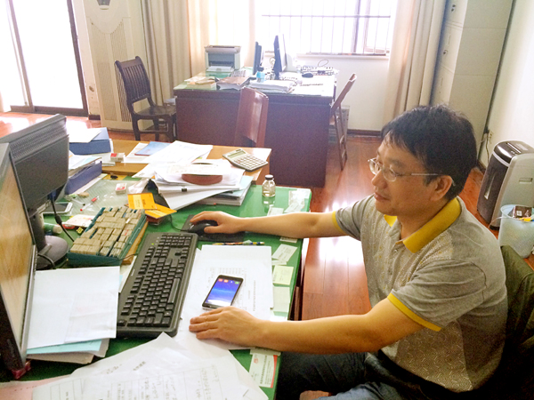 走進財務(wù)部的辦公室,周家煌的辦公桌上的擺設(shè)一目了然:桌面整潔干凈,桌上的文件排放的整齊有序。左上角壘起來的倆堆書籍,其一是《財務(wù)會計》、《中國稅務(wù)》等財務(wù)專業(yè)的雜志;另一堆書籍置于頂部的是《計算機財務(wù)管理:財務(wù)建模方法與技術(shù)》,往下的是諸如《計算機辦公軟件應(yīng)用》、《信息時代的財務(wù)創(chuàng)新》等。
