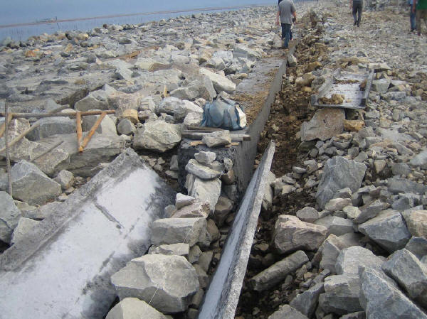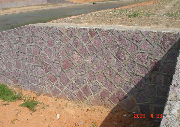 砌石護坡和擋墻面石外露面要求顏色一致,最小厚度應不少于20cm,砌筑時,上下兩層石塊應騎縫,避免通縫,內(nèi)外石塊應交錯搭接。不得在面石底面無漿墊塞片石。對有勾凸縫(縫寬一般2.5cm)要求的面石,其砌縫縫寬不應大于2.0cm。