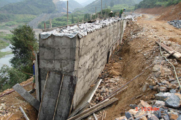 擋墻砌筑應分層,每一砌筑層擺石時均應座漿,隨鋪漿隨砌筑。嚴禁石塊大面無漿直接貼靠?;炷帘仨氂谜駬v器逐縫振搗。當豎縫寬度在5cm以上時,可填漿后塞片石。嚴禁先堆砌石塊再用膠結(jié)料灌縫。