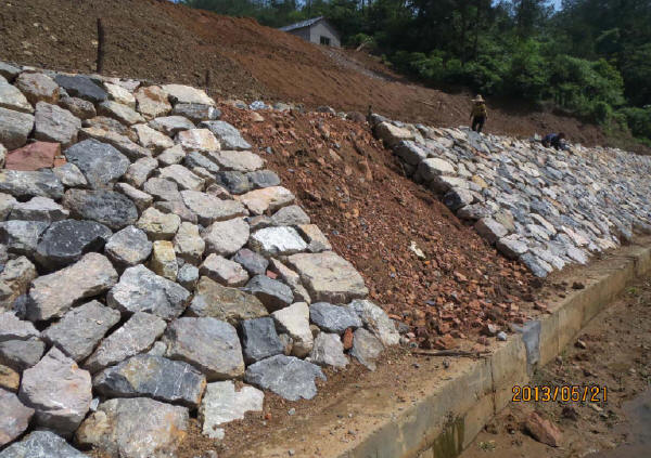 擋墻砌筑應分層,每一砌筑層擺石時均應座漿,隨鋪漿隨砌筑。嚴禁石塊大面無漿直接貼靠。混凝土必須用振搗器逐縫振搗。當豎縫寬度在5cm以上時,可填漿后塞片石。嚴禁先堆砌石塊再用膠結(jié)料灌縫。